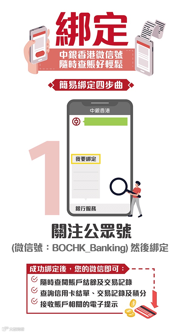 ·上述各項產品、服務與優惠受有關條款約束,詳情可向中銀香港職員查詢,或參閱本「綜合理財服務」條款、服務條款及零售銀行服務一般說明,客戶可於·中銀香港分行索取有關文件或瀏覽中銀香港網頁www.bochk.com。