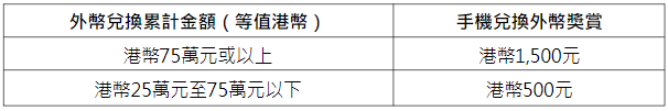 d.手機兌換外幣獎賞只適用於經中銀香港手機銀行辦理(a)以港元兌換為外幣的交易、(b)以外幣兌換為港元的交易及(c)交叉盤兌換交易(合稱「合資格兌換交易」)。手機兌換外幣獎賞並不適用於開立外幣定期存款並同時敍做的外幣兌換交易。