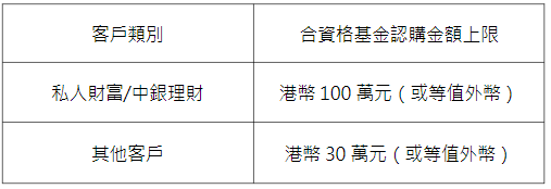 3.受本條款及細則所限,於基金優惠推廣期內,基金優惠合資格客戶透過電子渠道(即手機銀行或網上銀行的理財通專區)或分行(包括電話委辦指示服務)進行理財通基金認購(「合資格認購」),可享0%認購費(「認購費減免」)。合資格認購金額上限如下︰