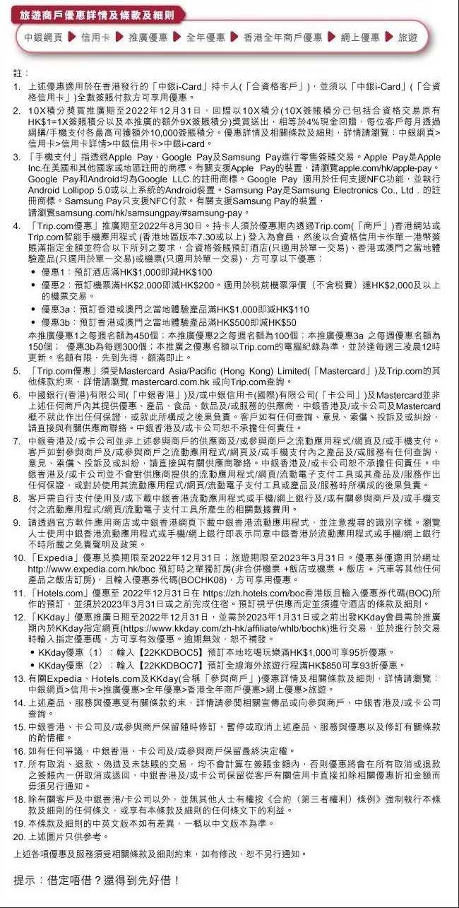 13. 有關Expedia、Hotels.com及KKday(合稱「參與商戶」)優惠詳情及相關條款及細則,詳情請瀏覽:中銀網頁>信用卡>推廣優惠>全年優惠>香港全年商戶優惠>網上優惠>旅遊。