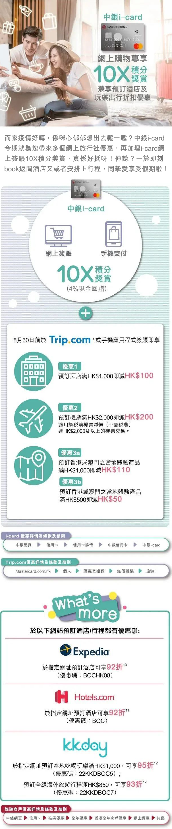 10. 「Expedia」優惠兌換期限至2022年12月31日;旅遊期限至2023年3月31日。優惠券僅適用於網址 http://www.expedia.com.hk/boc 預訂時之單獨訂房(非合併機票 +飯店或機票 + 飯店 + 汽車等其他任何產品之飯店訂房),且輸入優惠券代碼(BOCHK08),方可享用優惠。