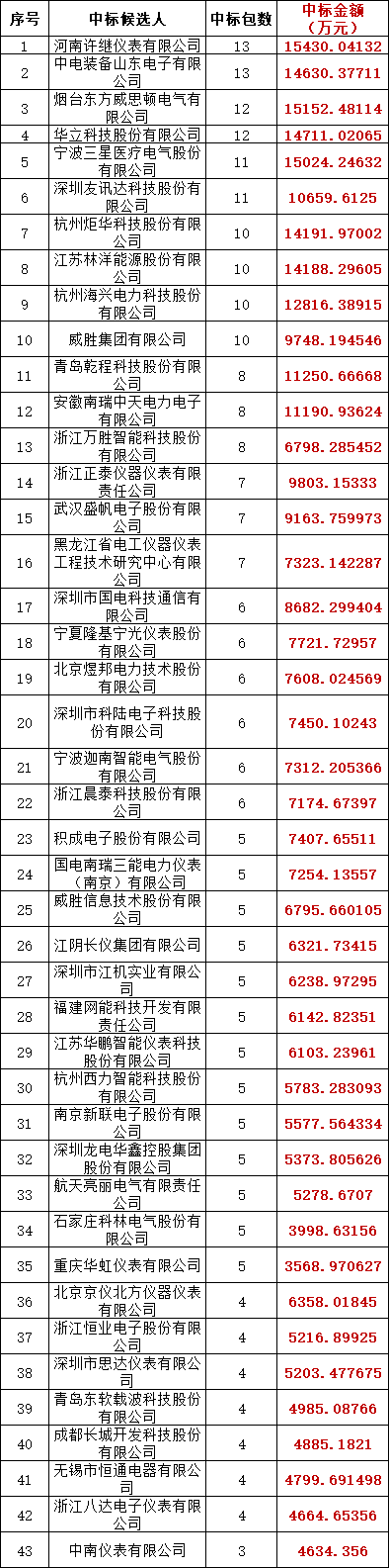 1、河南许继仪表有限公司,中标金额:1.543亿;