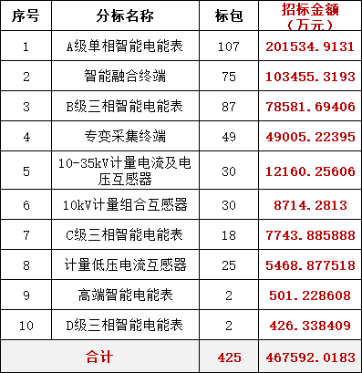 A级单相智能电能表排名第一:招标金额20亿,标包107个;