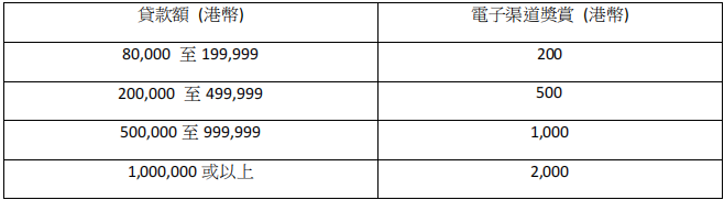 電子渠道奬賞優惠推廣期由2022年5月6日起至2022年6月30日(包括首尾兩天)(「電子渠道奬賞推廣期」),客戶並須於2022年7月29日或之前成功提取貸款,方可享此電子渠道奬賞(「電子渠道奬賞」)。