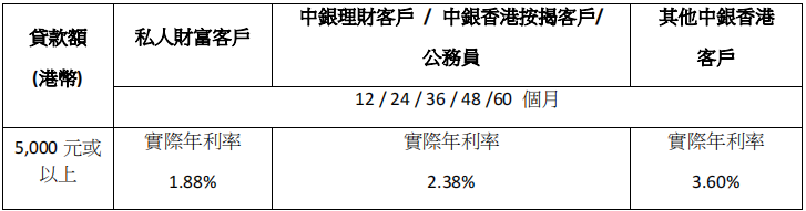• 有關客戶的信貸評級必須符合中銀香港要求。個別客戶獲批核的實際年利率按客戶的信貸評級、貸款金額及貸款年期而釐定。申請的最終審批、貸款金額、貸款年期及貸款利率將由中銀香港作最終决定,而毋須向客戶提供任何理由。
