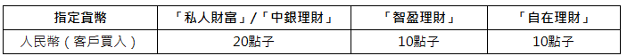 b. 此優惠只適用于「綜合理財服務」客戶透過中銀香港分行、網上銀行、手機銀行及專人接聽電話銀行服務以電匯價以港元買入人民幣,方可享以下外幣兌換點子優惠。
