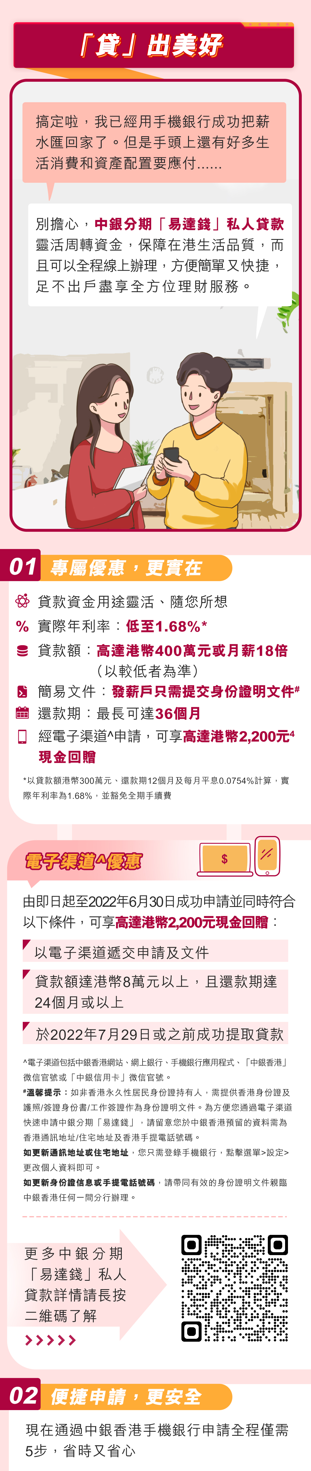 ● 推廣期由即日起至2022年6月30日(包括首尾兩天)(「推廣期」),客戶並須於2022年7月29日或之前成功提取貸款,方可享此中銀分期「易達錢」電子渠道奬賞(「電子渠道奬賞」)。