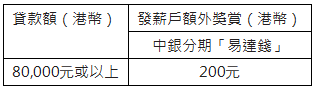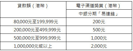 於推廣期內申請中銀分期「易達錢」,而成功貸款額達港幣8萬元或以上,及還款期達24期或以上;及