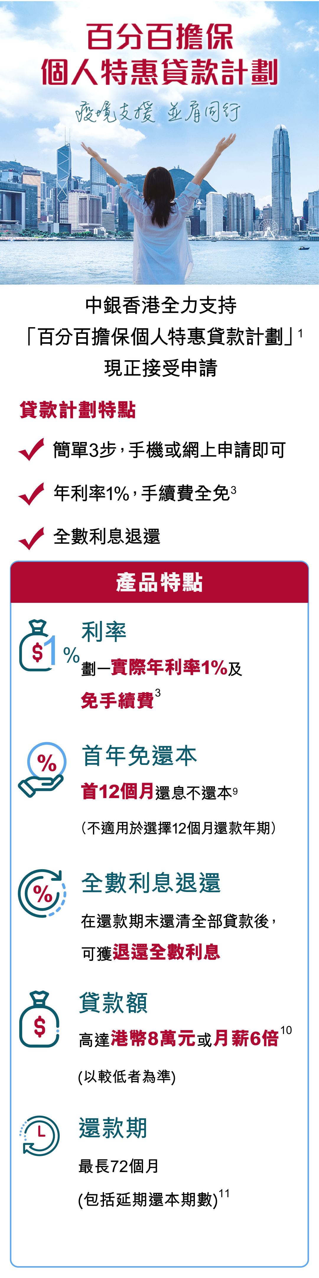 ● 上述産品須受中銀分期「易達錢」條款及「百份百擔保個人特惠貸款」條款約束(除另作註明外)。