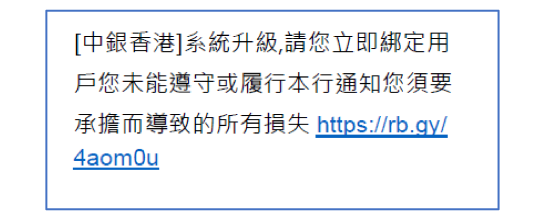 內容通常涉及本行的重要訊息,或要求收件人提供個人資料以核實賬戶,例如︰大額轉賬的交易通知或須啟用新的安全功能的通知,並要求收件人點擊超連結或開啟附件。