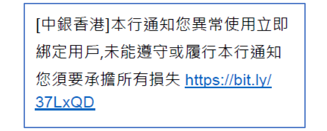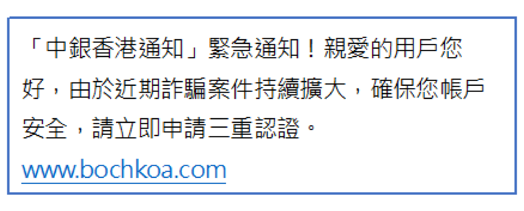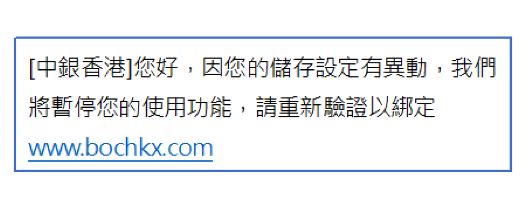 近日有騙徒發出附有偽冒中國銀行(香港) (「本行」)網站超連結的虛假短訊,訛稱客戶戶口設定出現異常或驗證未成功等,要求客戶點擊短訊內的超連結進行驗證,誘騙客戶在偽冒網站內輸入個人資料,如網上銀行號碼/用戶名稱、網上銀行密碼及單次短訊密碼等。本行已將有關情況知會香港金融管理局及香港警方。