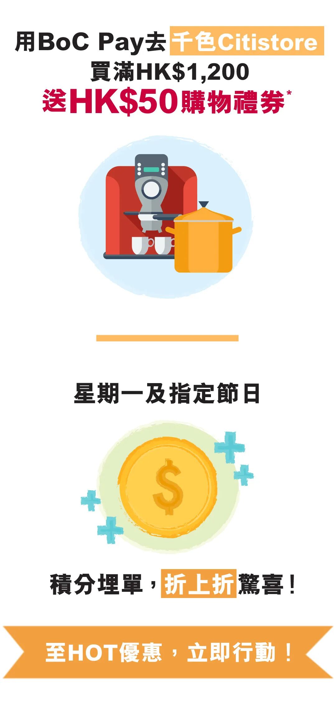「千色Citistore購物禮遇」優惠之推廣期至2021年10月10日。優惠適用於全線千色Citistore之香港店舖。優惠設有名額限制,而商戶各店每日送出之購物禮券數量有限,先到先得,換完即止。於整個推廣期內,每名客戶(以身份證明文件號碼計算) 每日只可享優惠獎賞一次。優惠不適用於荃灣店之Pokka Café、A-1 Bakery、Pacific Coffee、Zoff、Brotherhood Barber Shop及馬鞍山店之賞茶之消費交易。優惠不適用於購買購物禮券/現金券、網上購物、電郵或電話訂購、取消或退款交易、任何分拆簽賬之交易及其他未經許可之簽賬。客戶必須於簽賬當日及於指定換領時間內親臨千色Citistore之禮券換領處換領禮券。優惠所獲之千色Citistore HK$50購物禮券只供下次購物時使用,而使用禮券後之餘額必須以合資格中銀信用卡或BoC Pay付款。禮券的使用條款須受千色Citistore的相關條款所約束,詳情請參閱禮券上有關條款內容。客戶於上述推廣期內於千色Citistore所作之所有交易,將不視為「中銀信用卡簽賬高達10X積分獎賞」推廣之合資格簽賬,有關「中銀信用卡簽賬高達10X積分獎賞」推廣之詳情、條款及細則,請瀏覽中銀香港網頁 (中銀香港網頁>信用卡>推廣優惠>最新優惠)。