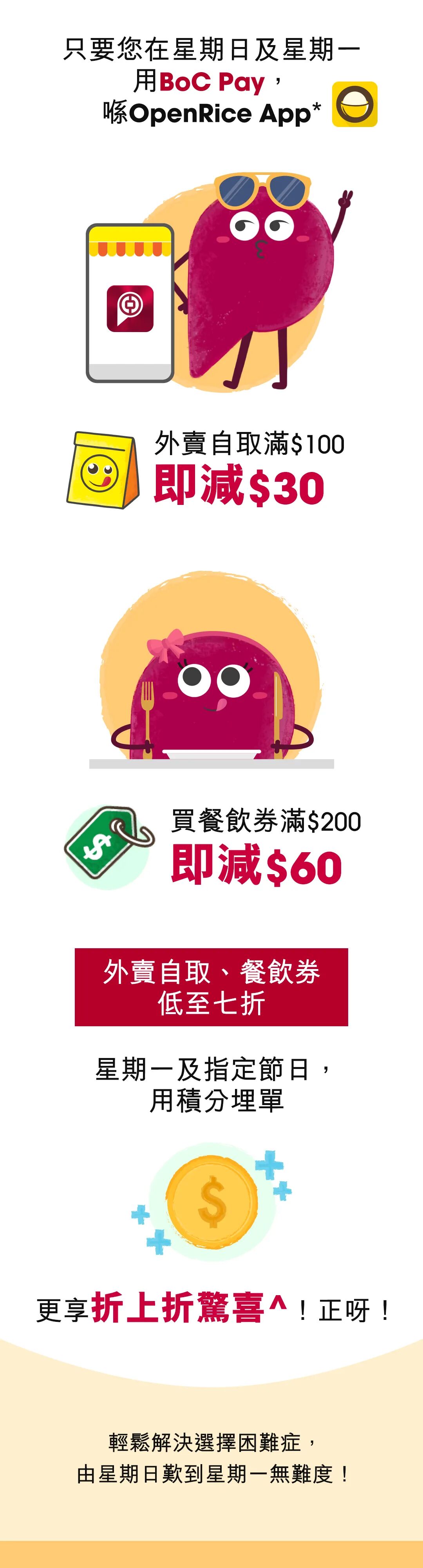 * OpenRice推廣期由2021年3月28日至6月28日內的星期日及一之香港時間上午11時正至晚上11 時 59 分,適用於透過OpenRice手機應用程式訂購外賣自取或餐飲券並以BoC Pay付款滿指定金額(以單一簽賬淨額計算)。優惠設有名額限制,先到先得,額滿即止。每名客戶於每個推廣日只可享上述優惠各一次。優惠受條款及細則約束,詳情請瀏覽BoC Pay流動應用程式或www.bochk.com/s/a/or