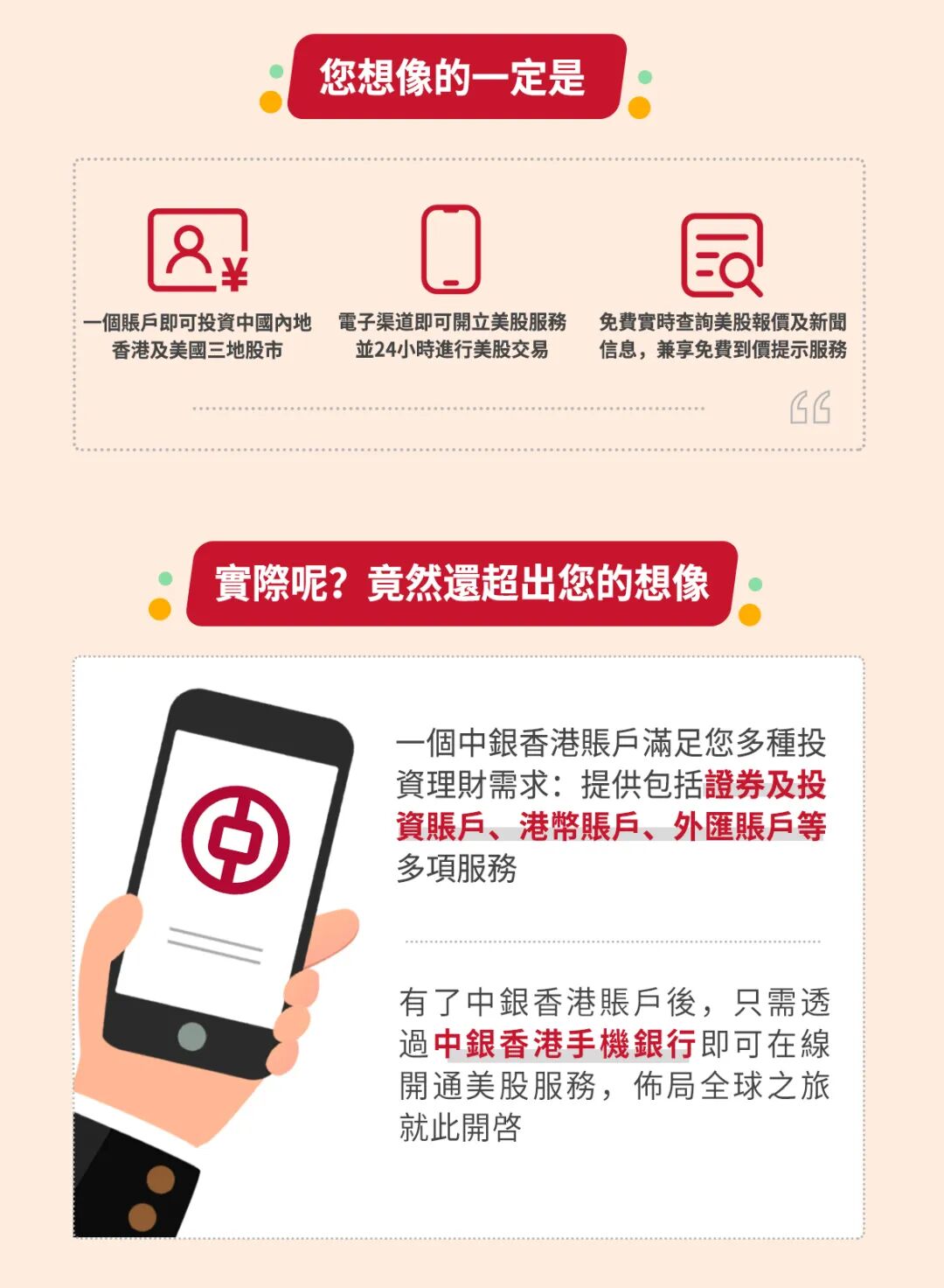 透過「中銀香港微服務」官號,讓您緊貼生活潮流資訊,瞭解銀行產品及精彩優惠。同時,您可透過綁定賬戶功能,隨時隨地於官號查詢賬戶資料,輕鬆理財!