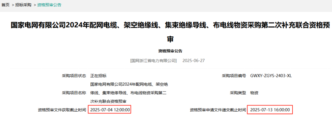 2025年6月27日,国网电子商务平台发布:国家电网有限公司2024年配网电缆、架空绝缘线、集束绝缘导线、布电线物资采购第二次补充联合资格预审: