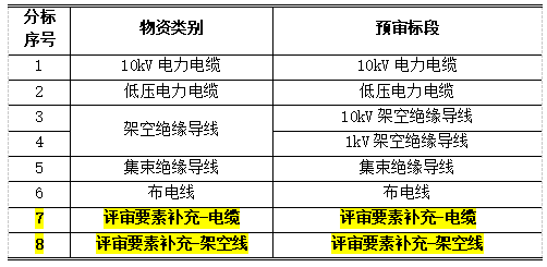 在本次的资格预审中增加了:评审要素补充-电缆、评审要素补充-架空线(详见下图)两个标段: