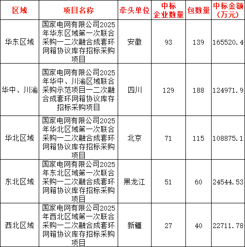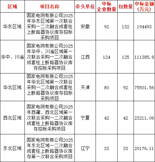 截止日前,国家电网2025年5大区域的(一二次融合成套柱上断路器/环网箱)第一次联合采购中标信息已发布;小编分析汇总详情如下: