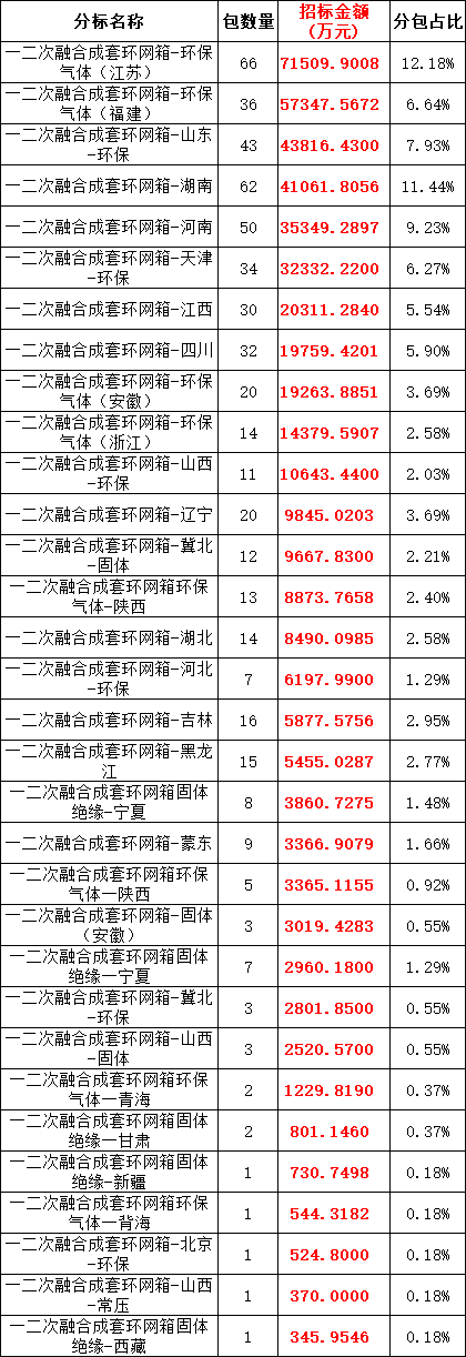 在环网箱分标中:江苏排名第一!招标金额71509.9万元;包数量66个;分包占比12.18%;