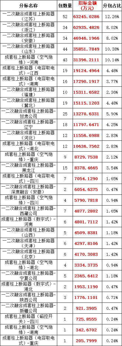 在柱上断路器分标中:江苏排名第一!招标金额63245万元;包数量52个;分包占比12.26%;