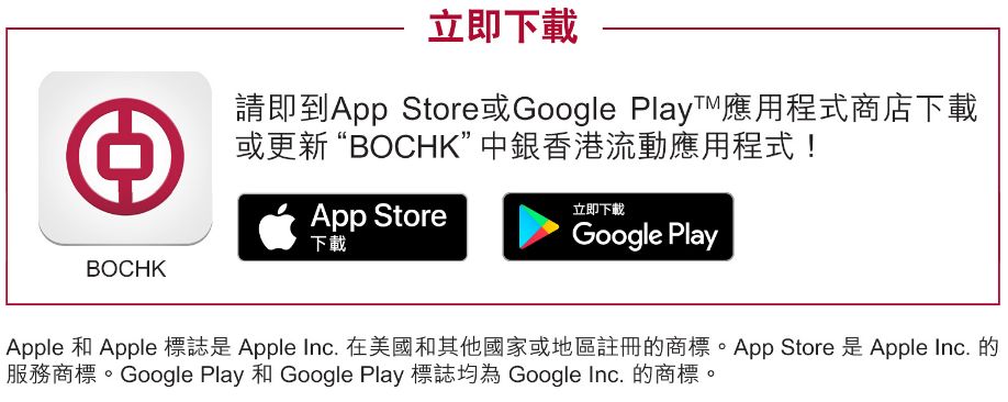 客戶可透過App Store或Google Play應用程式商店下載或更新“BOCHK”中銀香港流動應用程式。