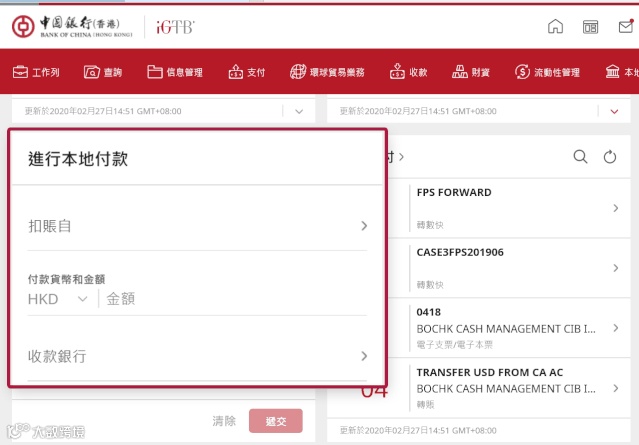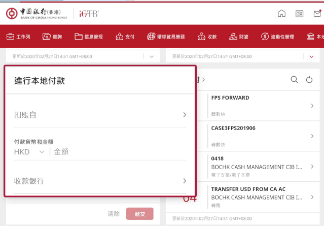 中銀香港提供豐富的在線付款服務,聯通本港及海外多家往來銀行,高效處理本地及跨境支付,為客戶提供輕鬆、高效、智能的支付體驗,幫助客戶做好支付決策。