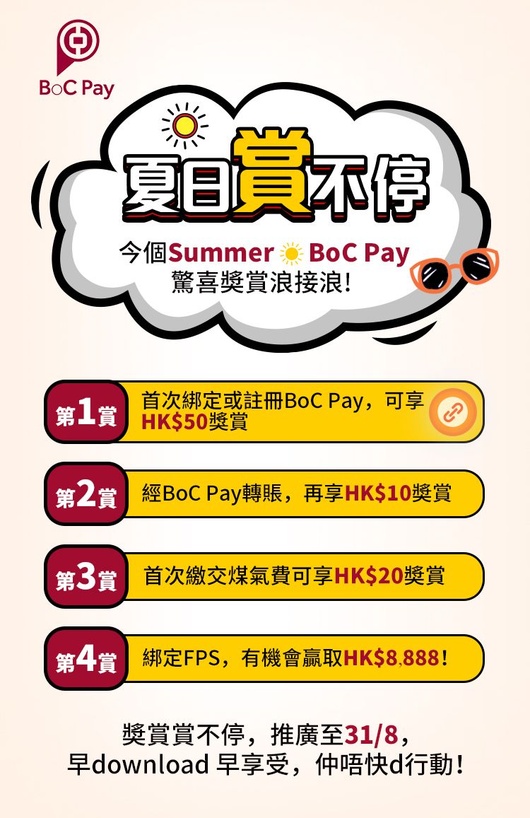 經BoC Pay轉賬可享HK$10;首次綁定或註冊更可享HK$50,讚!