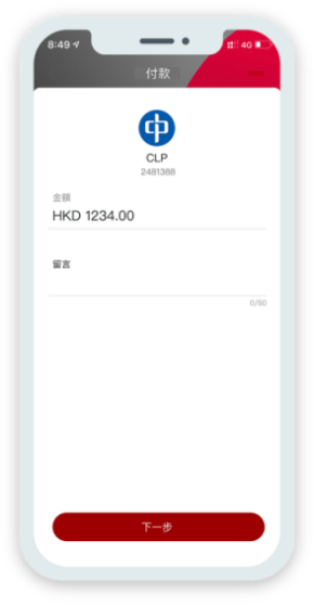BoC Pay會自動顯示賬單上的繳款金額,核對無誤後,按「下一步」