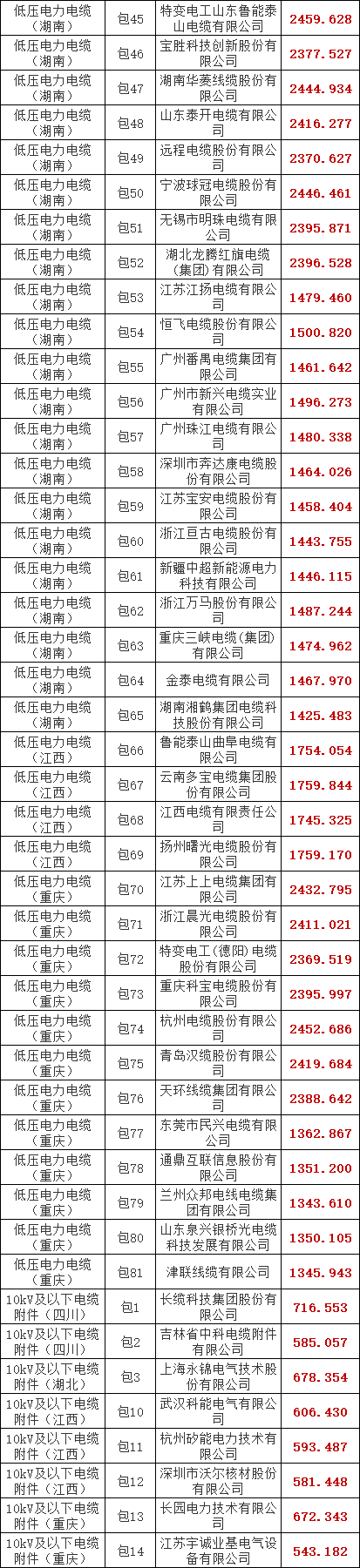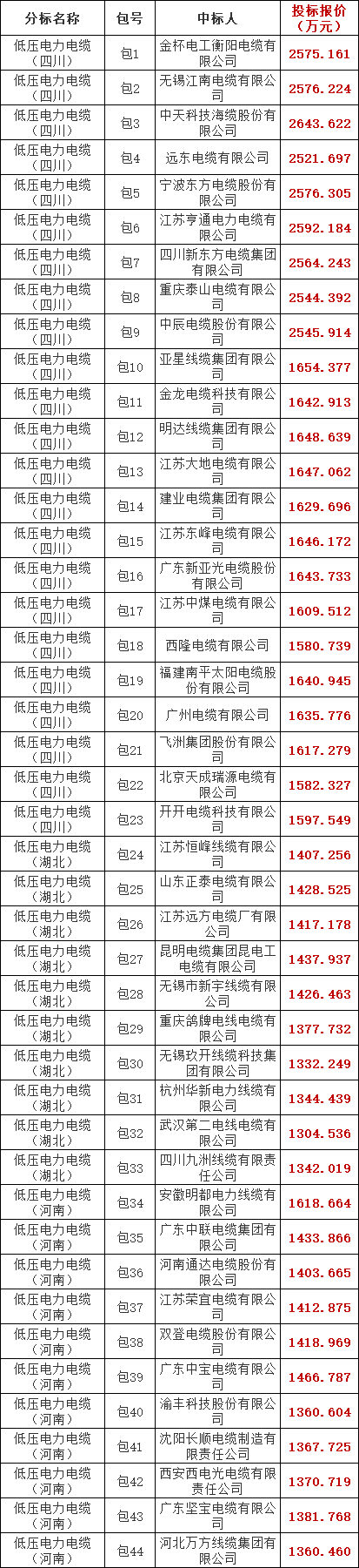 国家电网有限公司2025年华中、川渝区域第一次联合采购低压电力电缆、10kV及以下电缆附件协议库存招标采购(招标编号:GWLHCG-HZCYDYDL10kVDLFJ-2502)中标候选人公示活动已经结束。请各中标人自行在ECP2.0下载中标通知书,及时缴纳招标代理服务费(具体内容见附件)。现将中标人名单公告如下。