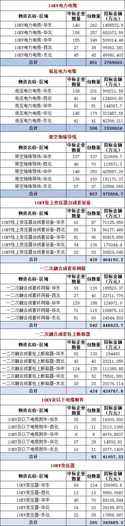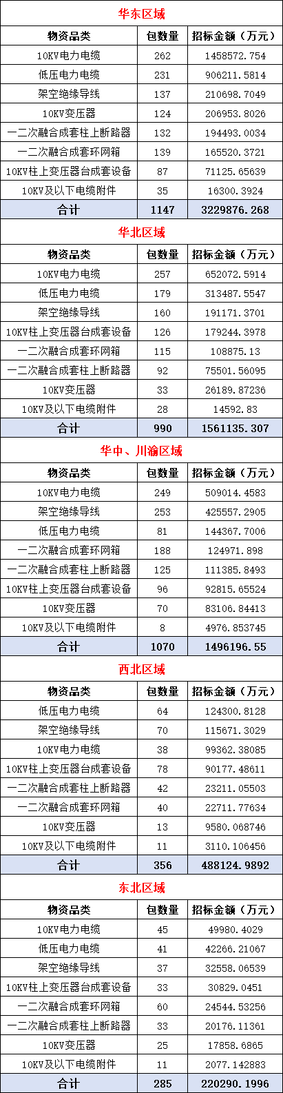 截至6月18日,国家电网2025年5大区域第一次联合采购8类物资中标信息均已完成公示,小编汇总详情如下: