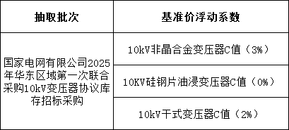 国家电网有限公司2025年华东区域第一次联合采购10kV变压器协议库存招标采购项目于应答截止日当日现场抽取基准价浮动系数(C值),并由采购人代表及监督人员现场见证。抽取结果公示如下: