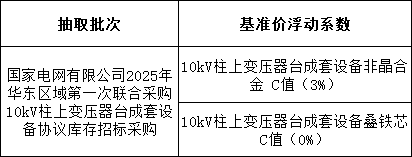 国家电网有限公司2025年华东区域第一次联合采购10kV柱上变压器台成套设备协议库存招标采购项目于应答截止日当日现场抽取基准价浮动系数(C值),并由采购人代表及监督人员现场见证。抽取结果公示如下: