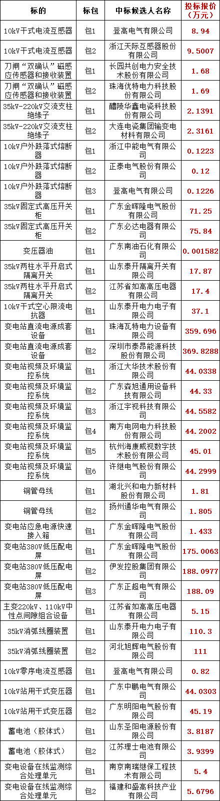 广西电网公司2025年省级物资集中采购生产类框架公开招标,经评标委员会评审,现将中标候选人公示如下:
