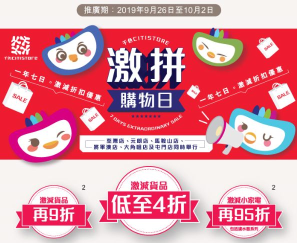 2. 激拼購物日之再9折/再95折優惠不適用於餐廳食肆,部份特約專櫃、部份貨品及部份寄售貨品;亦不適用於購買千色Citistore購物禮券。Citi-fun會員生日3倍積分優惠於激拼購物日暫停使用。如有任何爭議,千色Citistore保留最終確定權。