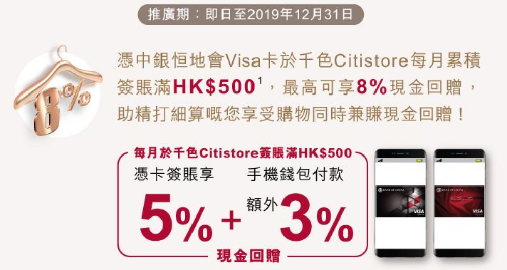 由即日到2019年12月31日,用中銀恒地會Visa卡去千色Citistore簽賬可賺高達8%現金回贈!同埋,依家至10月2日千色Citistore仲舉行緊大家期待已久嘅激拼購物日,俾您以至抵價買到您嘅心頭好!