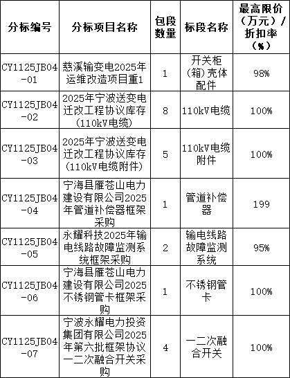 国网浙江电力2025年市场化项目第二次物资框架公开招标采购(宁波)项目,项目资金来自企业自有资金,出资比例为100%,资金来源已落实,招标人为国网浙江省电力有限公司宁波供电公司,并委托宁波永耀电力投资集团有限公司招标咨询分公司为招标代理机构。项目已具备招标条件,现对该项目进行公开招标。