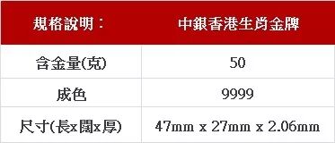 金牌售價以當時公佈的中銀香港九九九九金牌(50克)牌價為準。