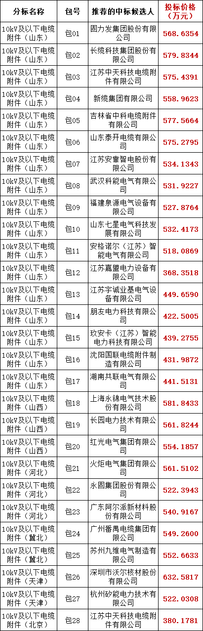 国家电网有限公司2025年华北区域10kV及以下电缆附件协议库存第一次联合采购项目评标工作已经结束,依据《中华人民共和国招标投标法实施条例》、《招标公告和公示信息发布管理办法》对中标候选人公示的规定,现将评标委员会推荐中标候选人予以公示,公示期3日。投标人或者其他利害关系人若对评标结果有异议的,请在中标候选人公示期间以书面形式(传真、邮箱)提出。