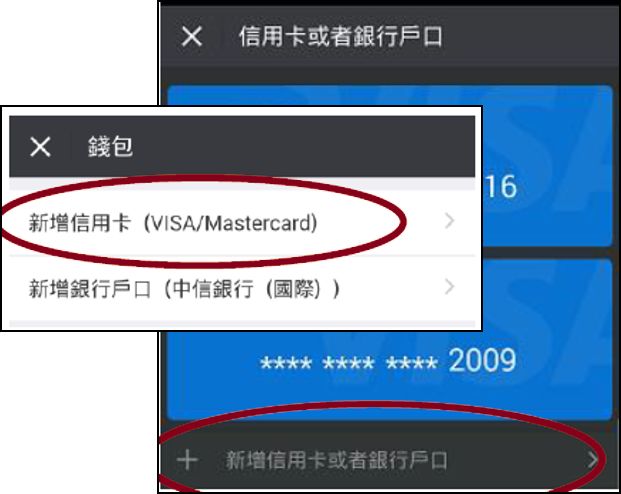 然后点击「银行卡」,点击「+新增信用卡或者银行户口」,选择「新增银行卡」,输入卡号码。