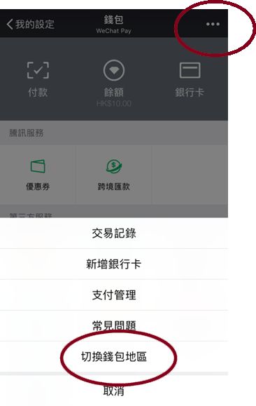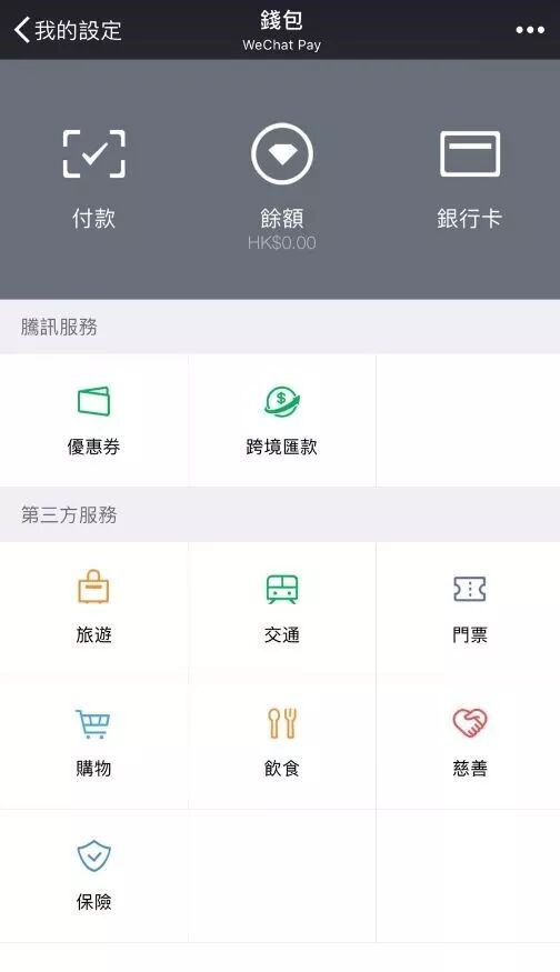 要绑定微信支付,需要在「我的设定」打开「钱包」功能,记得钱包地区切换为「香港」