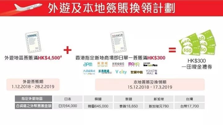 3.持卡人於2018年12月1日至2019年2月28日(下稱「外遊簽賬期」)以港澳發行之銀聯卡於日本、韓國、泰國、新加坡或台灣地區以當地單一貨幣簽賬滿HK$4,500(最多可累積5張於同一外遊地區及以同一銀聯卡簽賬之簽賬存根,而簽賬金額按預設匯率計算)(下稱「外遊簽賬」),並於2018年12月15日至2019年3月17日(下稱「本地簽賬期」或「換領期」)以同一銀聯卡於指定新地商場單一簽賬滿HK$300(下稱「本地簽賬」),可換領HK$300一田現金禮券(下稱「禮券」)。