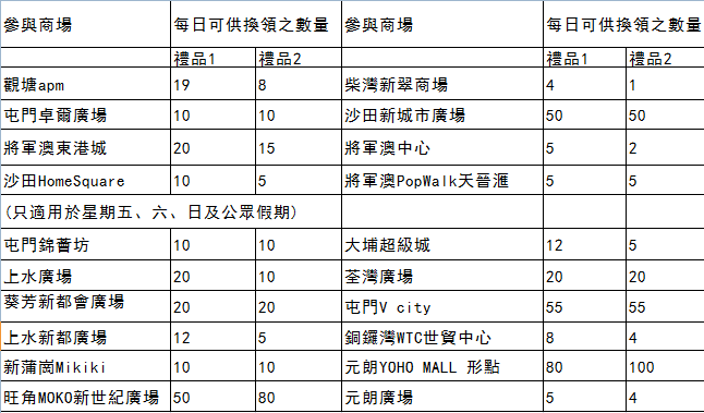 2.參與換領計劃之新鴻基地產代理有限公司(下稱「新鴻基地產」)旗下商場包括:觀塘apm、將軍澳東港城、葵芳新都會廣場、旺角MOKO新世紀廣場、沙田新城市廣場、大埔超級城、荃灣廣場、屯門V city、銅鑼灣WTC世貿中心及元朗YOHO MALL 形點(下稱「指定新地商場」)。