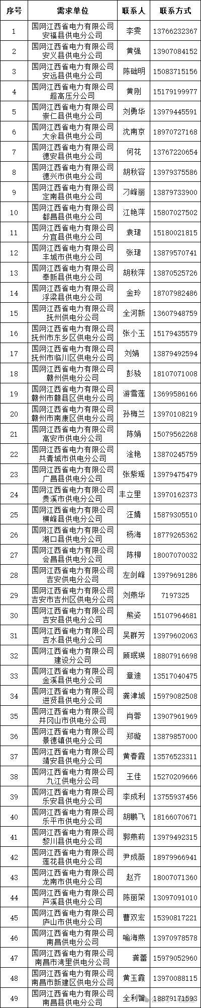 6.实物ID订货协议签订。根据《电网资产统一身份编码建设推广实施总体工作方案》相关工作要求,为进一步推进电网资产统一身份编码推广实施工作。请这3个批次中涉及需贴标设备的供应商(清单详见附件)完成RFID订货协议的签订。联系人:曾女士0791-88646431,QQ群:1017218054