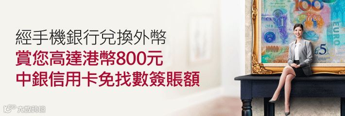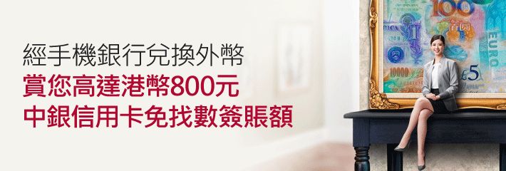由即日起至2018年6月30日,「中銀理財」及「智盈理財」客戶經手機銀行兌換外幣達指定金額,可享高達港幣800元中銀信用卡免找數簽賬額!