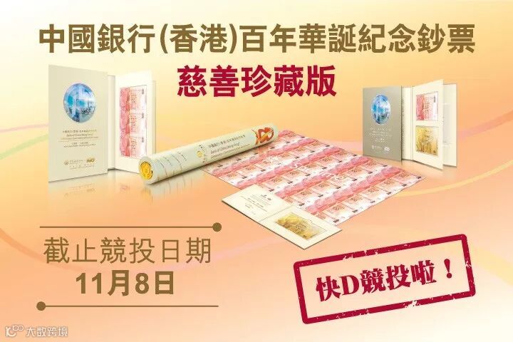 「中國銀行(香港)百年華誕紀念鈔票慈善珍藏版」競投到11月8日就截止啦!慈善珍藏版紀念鈔數量有限,只有388套,全部號碼都經過精心挑選,包括「六連號」同埋六個順序號嘅靚冧把等等,冠字方面就分無英文冠字和冠字AA、BC及HK。今次嘅包裝好有特色,每套包裝都配上999足金金頁一張,淨重2克,金頁嘅設計同尺寸與紀念鈔單鈔完全一樣,只係不含號碼。靚冧把加埋金頁,絕對值得珍藏!大家千萬唔好錯過!
