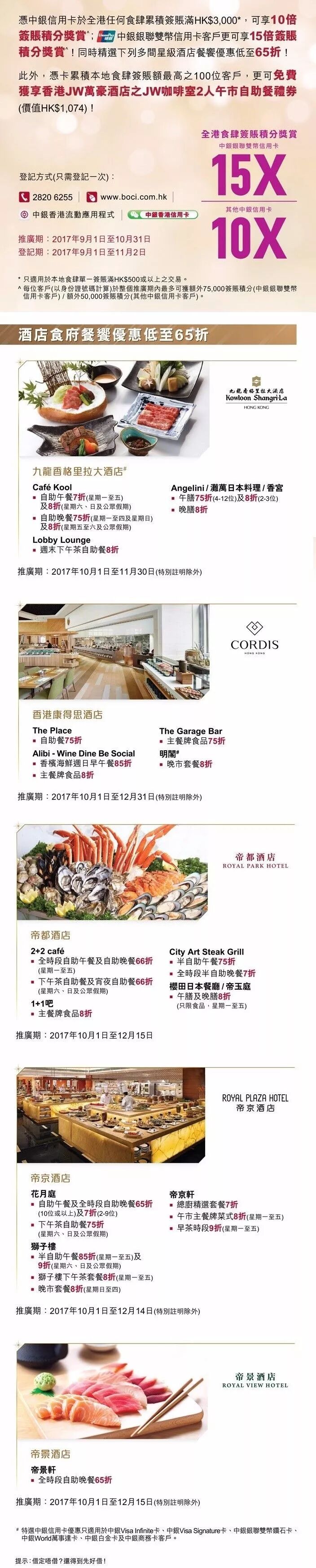 中銀信用卡為您帶來多間星級酒店餐饗優惠低至65折,仲有齊中、西、日多種款式選擇,一定有一樣啱您口味!即刻掃落去睇下有咩優惠,再約埋親朋好友去食好嘢啦!