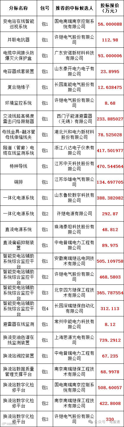 国网浙江省电力有限公司2025年第一次物资公开招标采购的评标工作已结束,依据《中华人民共和国招标投标法实施条例》、《招标公告和公示信息发布管理办法》对中标候选人公示的规定,现将评标委员会推荐的中标候选人予以公示,公示期3日。投标人或者其他利害关系人若对评标结果有异议的,请在中标候选人公示期间以书面形式(传真)提出。