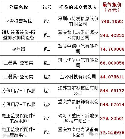 国网重庆市电力公司2025年新增第二次非电网零星物资流标项目框架竞争性谈判采购评审工作已经结束。依据《中华人民共和国招标投标法实施条例》、《招标公告和公示信息发布管理办法》对成交候选人公示的规定,现将评审委员会推荐的成交候选人予以公示,公示期1日。应答人或者其他利害关系人若对评审结果有异议的,请在成交候选人公示期间以书面形式(邮件)提出。