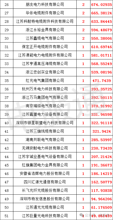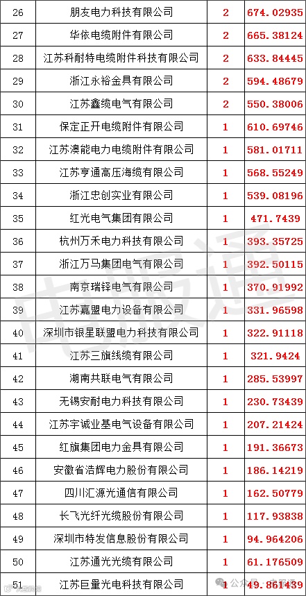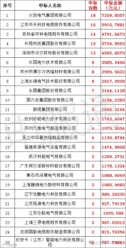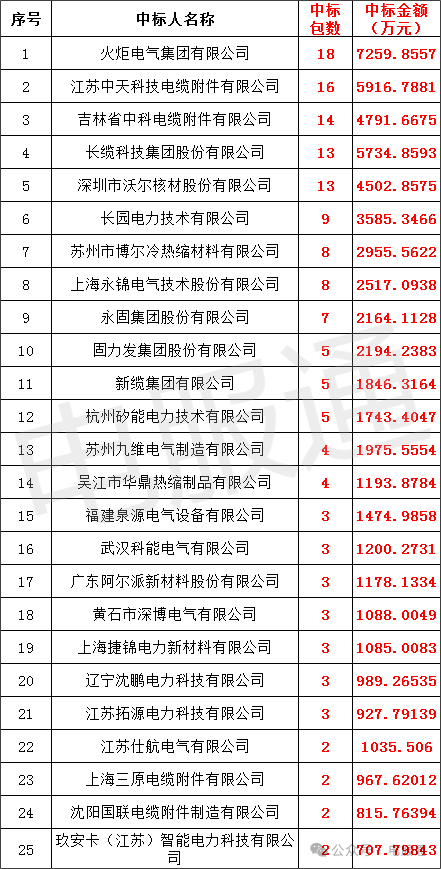 中标金额排名前三的是:火炬电气集团有限公司7529万元,江苏中天科技电缆附件有限公司5916万元,长缆科技集团股份有限公司5734万元;