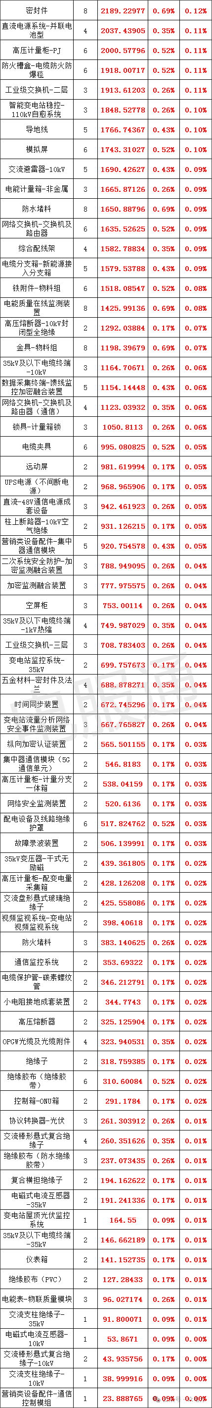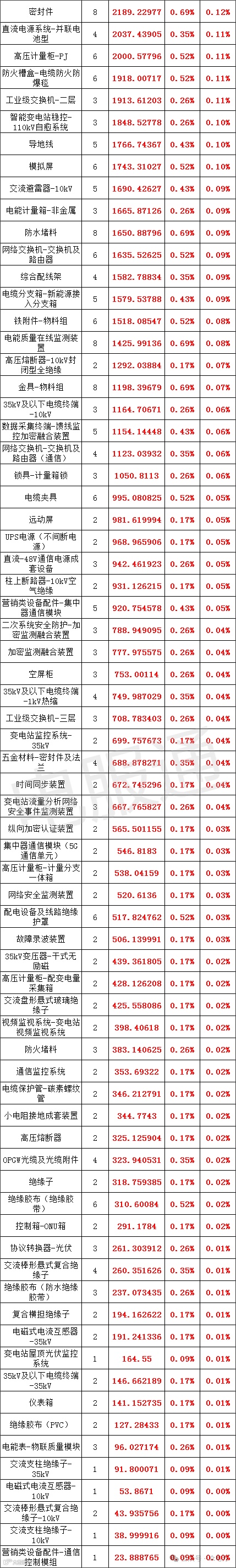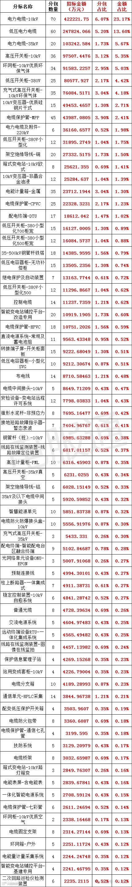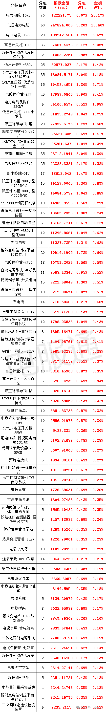 招标金额前三的是:电力电缆-10kV422221万元,低压电力电缆247824万元,电力电缆-35kV103242万元;