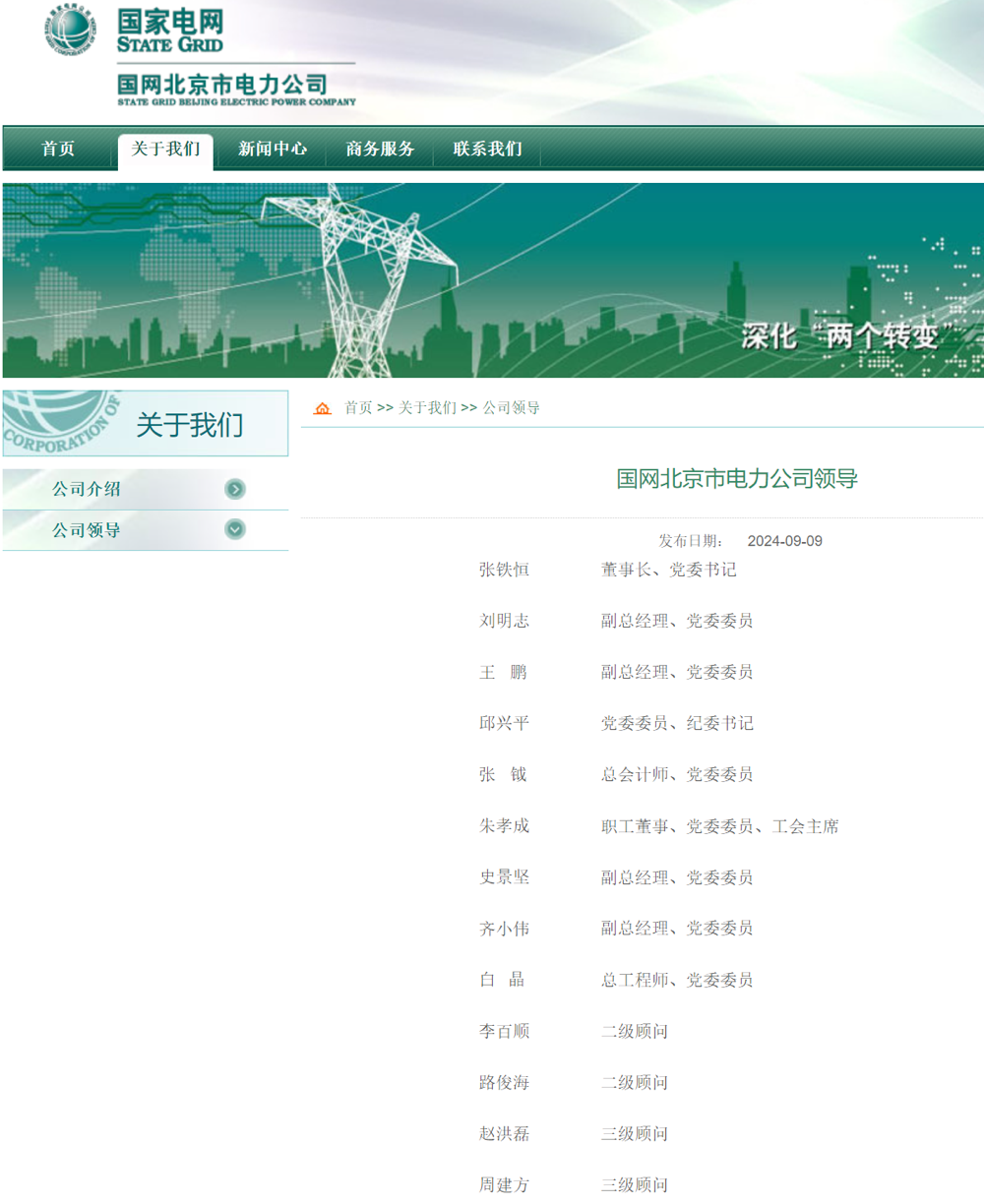 9月份,国网北京市电力公司官网中,领导班子名单出现调整,如下: